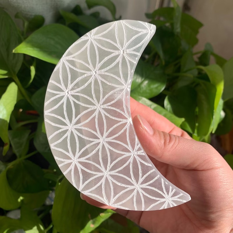 Selenite Moon Plate With Flower of Life